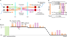 In our experiment, the quantum memory is based on the atomic frequency comb (AFC) protocol, according to which the absorption band of the Nd3+-ion ensemble in the crystals (see Methods for the details of the quantum-memory sample) must be tailored into a frequency comb. The period of the frequency comb (denoted as Δ) determines the storage time of the single photons (Tstorage), and the range of the frequency comb determines the memory bandwidth. The details about the AFC quantum memory technique are presented in the Methods and in Supplementary Note 4, and a sketch is shown in Supplementary Fig. 4.