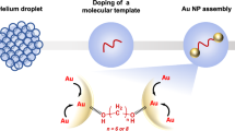 Analytical TEM investigations reveal smaller clusters mainly consisting of a single silver core, surrounded by a gold shell, whereas larger clusters contain two or more silver grains embedded in a gold matrix (Fig. 1b, c and Supplementary Fig. 2). The largest diameters of single-core clusters were measured to be 5 nm, whereas the smallest double core clusters amounted to 7 nm. With the transition threshold between a single- and double-core set between these numbers, a cluster size of ∼5,000 atoms (2,500 Ag/Au atoms) or an initial droplet size of 5 × 107 He atoms can be obtained as a crossover value. Based on a simple estimation of the recombination time for two atoms inside a helium droplet20, a transition from single-centre growth to multi-centre growth has been predicted at an initial droplet size of 5 × 105 He atoms. Applying more elaborate ab-initio simulation data21 as a model, one can calculate the entire growth behaviour of clusters inside a droplet (Methods). Thereby, newly added dopant atoms aggregate very fast, keeping the total number of clusters inside the droplet low. At the droplet size where multi-centre aggregation starts (5 × 105 He atoms), initially separated clusters will aggregate very shortly after the droplet leaves the first pickup cell. In sufficiently large droplets, however, two or more separated clusters of the first species can survive until they arrive at the second pickup cell. Using our experimental parameters in this model (Fig. 1d), we find the crossover between single- and double-core clusters at 4,000–5,000 atoms (initial droplet size: 4–5 × 107 He atoms), matching well with the experimental value and supporting our model for multi-centre aggregation. The experimental parameters and setup can be used to tune the mean cluster size and composition19 to favour either single- or multi-core clustering and thereby customize the clusters’ properties, such as their optical response20. In even larger droplets than investigated here, gold and silver can potentially condensate independently inside the droplet6.