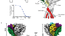 The kinase activity of SAD-A was determined using the synthetic Cdc25C peptide (201DQEAKVSRSGLYRSPSMPENLNRPRLKQVE230, SciLight Biotechnology) as substrate. The standard assay was performed with 5 nM SAD-A protein (full-length, fragments or mutants) and indicated amounts of the Cdc25C peptide at 25 °C, in 1.8-ml reaction mixture containing 50 mM MOPS, pH 7.0, 100 mM NaCl, 0.1 mM EDTA, 10 mM MgCl2, 1 mM ATP, 200 μM NADH, 1 mM phosphoenolpyruvate, 20 U ml−1 lactate dehydrogenase, and 15 U ml−1 pyruvate kinase. This spectrophotometric kinase assay couples the production of ADP with the oxidation of NADH by pyruvate kinase and lactate dehydrogenase28. Progress of the reaction was monitored continuously by following the decrease of NADH at 340 nm on the PerkinElmer Lambda 45 spectrophotometer, and the initial rates were determined from the linear slopes of the progress curves. The kinetic parameters (kcat and Km) were obtained by fitting the experimental data to the Michaelis–Menten equation using a nonlinear regression analysis programme. The concentrations of ADP generated in the SAD-catalyzed reaction were calculated with an extinction coefficient for NADH of 6,220 M−1 cm−1 at 340 nm, and concentration of the Cdc25C peptide was determined by turnover with the activated SAD-A under condition of limiting Cdc25C peptide.