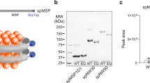(a, b) SDS-PAGE analysis of the proteolysis of lipid-free MSPΔH5 and cNW9. Samples were treated with V8 protease for 0 min (before addition of V8), and for 1, 3 and 18 hours. Lanes are labeled with times of protease treatment. Proteolysis was performed in 20 mM Tris-HCl, pH 7.5, 100 mM NaCl at 37°C and using a protein:protease ratio (w/w) of 1000:1. Treatment of MSPΔH5 with V8 resulted in the appearance of a large peptide, which is close in size to MSPΔH5 and is not discernible until about 18 hours after addition of V8; this peptide may be generated earlier but is not visible due to the low amount or overlap with uncleaved MSPΔH5. The intensity of the MSPΔH5 band decreased by 75% after 3 hours and by 93% after 18 hours. On the other hand, the intensity of the cNW9 band decreased by only 20% after 18 hours. A band that corresponds to linearized NW9 was observed after 3 hours and increased in intensity after 18 hours. (c, d) SDS-PAGE analysis of the proteolysis of nanodiscs assembled with MSPΔH5 and cNW9. Samples were treated with V8 protease for 0 min (before addition of V8), and for 20 min, 1, 3 and 18 hours. Proteolysis was performed at 37°C at pH 7.5 in 20 mM Tris-HCl, 100 mM NaCl using a 100:1 protein:protease (w/w). The band intensity of MSPΔH5 decreased by 81% after 3 hours. There was no decrease in the cNW9 band intensity up to 3 hours. The ImageJ software was used for analyzing band intensities.