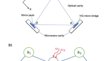 where κi (κo) is the corresponding input (output) dissipation rate due to the coupling between the feed line and the cavity. The total cavity decay rate is given by κtot=κi+κo+κint, with κint being the intrinsic loss rate of the cavity. The self-energy , where ωFMR is the angular frequency of the FMR mode, which has a damping rate γFMR, and ωMS is the angular frequency of the MS mode with a damping rate γMS. Using S21 in equation (4) to fit the experimental results (see Supplementary Material for the simulated transmission spectra), we can evaluate the damping rates γFMS and γMS as well as the total decay rate κtot of the cavity. These evaluated parameters and the calculated cooperativity are summarized in Table 1. The experimental parameters show that , with a cooperativity in most cases, indicating that the strong coupling regime is reached when both FMR and MS modes in the YIG sphere interact with the same cavity mode. In the experiment of Figure 2, the measurements were implemented at 22 mK using a dilution refrigerator. This very low temperature corresponds to a negligible average thermal photon number in the 3D cavity (e.g., ~1×10−2 for the fundamental cavity mode). Accordingly, for the probe microwave tone in the measurements, we used a very weak input power of −130 dBm in Figure 2a,b and a weak input power of −100 dBm in Figure 2c,d, which correspond to average microwave photon numbers ~0.8 and 800, respectively, for the fundamental cavity mode. Note that the measured transmission spectra in Figure 2c, d are very close to those in Figure 2a, b, even though the average microwave photon number in the cavity has increased from ~0.8 to 800. Owing to the small number of photons in the cavity, especially in the case of −130 dBm, the measured results clearly show that a strong magnon–photon coupling has been experimentally achieved in the quantum regime for both the FMR and MS modes coupled to the same cavity mode. Moreover, because γMS~2γFMR at 22 mK (Table 1), the experimental results reveal that the newly observed MS mode exhibits quantum coherence nearly as good as the FMR mode at cryogenic temperature.