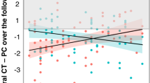 where Y represents CT, d1 is the random within-subjects effect, β1-5 represent regression coefficients, and ε is residual error. ProxyBV (subcortical gray matter+white matter+cerebrospinal fluid volume) was entered as a covariate, based on rationale provided by ref. 29. Briefly, this variable excludes GM volumes, which would otherwise account for ~40% of total intracranial volume and is highly correlated with mean CT. The proxy measure of brain volume bypasses the potential of removing the effect of interest, while still controlling for important confounds associated with brain volume. To test for a main effect of time, data were filtered to examine each group separately, and ‘β1(Group)’ was replaced with ‘β1(Time)’ in the mixed effects model. To test for the interaction between scan time (Baseline, FUP1 and FUP2) and group, two additional terms were added: ‘β6(Time)’ and ‘β7(Group×Time)’.