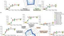 Peak values and statistics are shown in Table 1. Compared with placebo, LSD increased blood pressure, heart rate, and body temperature as well as pupil size in the dark and after a light stimulus (Table 1). These effects were similar for both doses (no drug × dose interaction). Compared with placebo, both doses of LSD increased the total acute (0–10 h) adverse effects. Only the high dose increased the total subacute (10–24 h) adverse effects. Adverse effects 24–72 h were slightly increased in the total sample but not in the individual studies (Table 1). The frequently reported adverse effects are presented in Supplementary Table S2. There were no severe adverse events.