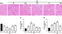The brain-water content was assessed using the wet-dry method21. The brain was divided into the ipsilateral (hemorrhagic) side and contralateral side, weighed on an analytical microbalance and then dried at 100 °C for 48 h to determine the dry weight. The brain-water content (%) was measured accordingly (wet weight–dry weight)/wet weight × 100%.