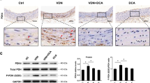 Primary VSMCs (pVSMCs) were prepared from the thoracic aortas of 6-week-old male Sprague–Dawley (SD) rats (150–200 g) (DBL, Eumseong, Korea). Rats were anesthetized with an intraperitoneal injection of ketamine (80 mg/kg) and xylazine (40 mg/kg) under sterile conditions according to the methods in a previous report22. The rats were then placed in the supine position, and their chests were opened. The thoracic aorta of each rat was removed and transferred to a culture dish containing cold phosphate-buffered saline (PBS). The rats were then euthanized by cervical dislocation. Next, following the removal of the fat tissue around the thoracic aorta, the aorta was cut into 2 mm tissue blocks and transferred to a 25 cm2 flask with its luminal surface in contact with the flask wall. To assist adherence of the explanted tissue to the plastic culture substrate, the T-flask was kept upright for 2 h in the incubator and then carefully positioned horizontally so that the medium covered the aortic tissues. The explants were not disturbed for 4 days. Cells were trypsinized and seeded into a 60 mm cell culture dish. VSMCs from passage 3 to passage 8 were used (Supplementary Fig. 1).