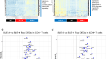 Here, to address this limitation, single-cell RNA sequencing (scRNA-seq) was employed to profile individual PBMCs in patients with SLE8,9,10,11. The analysis of immune cell heterogeneity within and among patients with SLE revealed several key findings: (1) the identification of >20 distinct cell subsets actively involved in disease pathogenesis, (2) global and cell type-specific expression of interferon gene signatures across various immune cells and (3) differences in certain cellular compositions in comparison to controls, such as a decrease in naive CD4 T cells and an increase in repertoire-restricted CD8 T cells. Notably, Perez et al. proposed that cell type-specific expression patterns precisely predict caseācontrol status and enable the stratification of patients into molecular subtypes11. Furthermore, multiple studies have suggested the potential roles of specific cell components in SLE pathogenesis, such as double negative switched memory B cell (CD27āIgDāCXCR5āCD11c+DN2 cells) and atypical B cell (ABC) populations (CD11c+TBX21+)8,10,11,12. These studies also demonstrated that a subset of CD8 T cells, such as CD8 effector/memory T cells with elevated expression levels of cytotoxic genes, undergo clonal expansion and may have a substantial influence on disease progression.