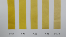 The change in the color of the paper was determined using a solid reflection spectrophotometer (CM-700D from Minolta Co., Japan) according to the standard ISO 11475:2004 [18]. The conditions used in the experiment were the standard illuminant D65 and the 10° observer. The CIEL*a*b* color space was used, and the color variations were evaluated using the parameter total color difference (ΔE*). The samples were always measured at five identical places. The average color difference was expressed as \(\Delta E = \sqrt {\left( {\Delta L*} \right)^{2} + \left( {\Delta a*} \right)^{2} + (\Delta b*)^{2} }\).
