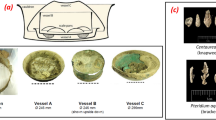 In order to provide a first chemical screening of the composition of the organic fraction of the shards, FT-IR was employed. Powdered samples were collected from the ceramic fragments and subdivided into three 100 mg aliquots for each sample. Each aliquot was treated with one solvent, namely acetone, methanol or dichloromethane, in order to exploit the different extraction capability of solvents with different polarity [4, 44, 45]. Extraction was performed in a glass vial. 2 mL of the solvent was added to the powder, favouring the interaction between the solid and the solvent by a Vortex lab shaker. After 2 min of treatment, the system was allowed to settle for about 4 h, then the liquid fraction was transferred into another vial and left to dry in a fume hood. The resulting deposits were collected, set in a diamond anvil cell and analysed in transmission mode using a Vertex 70 FT-IR benchtop spectrometer by Bruker, equipped with a Hyperion 3000 Microscope. Spectra were collected in the range from 4000 cm−1 to 400 cm−1, with a resolution of 4 cm−1 and 64 scan acquisitions.