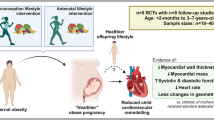 Over half of women now enter pregnancy overweight or obese [1, 2]. Obesity in pregnancy programmes the infant for cardiometabolic disease in both childhood [3] and adult life [4, 5]. Even before birth, high maternal pre-pregnancy body mass index is associated with impaired ventricular function and septal thickening in the first trimester foetus [6] and reduced diastolic function near term [7]. The risk for eccentric left ventricular hypertrophy at 6 years of age is also greater in the children of obese women [8, 9]. Diet-induced obesity in pregnant experimental animals similarly induces offspring cardiac hypertrophy and impaired cardiac function both before and after birth [10,11,12,13,14]. Specifically, maternal obesity increases cardiac weight, wall thickness, cardiomyocyte cross-sectional area and collagen content in the foetus and adult offspring [14,15,16]. Adult offspring have enhanced ventricular expression of genes normally expressed in the foetal heart but characteristic of postnatal pathological hypertrophy, such as β myosin heavy chain (Myh7), skeletal muscle alpha actin (Acta1), atrial natriuretic peptide (Nppa) and brain natriuretic peptide (Nppb) [13, 14]. Cardiac protein kinase B (Akt), mechanistic target of rapamycin (mTOR), extracellular signal-regulated kinase 1/2 (ERK1/2) and mitogen-activated protein kinase (MAPK) signalling pathways are also activated in offspring of obese dams [11, 13, 14]. These findings suggest that cardiomyocyte hypertrophy occurs in foetuses of obese mothers and is linked to the over-abundant supply of nutrients and elevated concentrations of insulin and other growth-promoting hormones in utero [11, 13, 14].