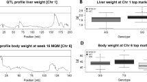 Genomic DNA sequences of all protein-coding positional candidate genes were downloaded using bioMART [24]. To include regulatory regions such as promoters, we considered additional 1000 base pairs from the start and end position of each gene. Monomorphic genes without sequence variants between S1 and S2 were removed from the list of positional candidate genes. All other genes were scored for potential functional effects of sequence variants, gene expression differences between S1 and S2 in gonadal adipose tissue and liver, and their contribution to KEGG pathways [25]. Coding sequence variants leading to stop gain/stop loss codons and missense mutations located in functional protein domains were awarded 3 points to the gene score. A missense variant with either a deleterious or a tolerated SIFT (Sorting Intolerant From Tolerant) value obtained 3 or 1 point, respectively. Non-coding variants were scored based on their location in potential functional sites. If a non-coding variant was located in the promoter or in a splice site, 3 points were awarded; if located in untranslated regions (UTRs), enhancers, or CTCF binding sites (involved in 3D structure of chromatin) 1 point was awarded. Genes differentially expressed in at least one tissue were awarded 2 points. Genes annotated in relevant KEGG metabolic pathways were awarded 1 point. Genes in KEGG pathways were downloaded using the R package “StarBioTrek” [26]. To find further evidence for potential causality, the highest scored candidate genes were screened for metabolic processes or diseases using Gene Ontology, public literature, and databases such as Mouse Genome Informatics and the International Mouse Phenotyping Consortium.