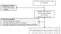 Preliminary PM2.5 concentrations were obtained via the Environmental Protection Agency’s (EPA’s) internet database (www.epa.gov/airdata) from four air quality monitors located in Reno and Sparks (see Fig. 1B for exact locations). These federal equivalent method (FEM) PM2.5 monitors were hourly Beta Attenuation Monitors (Met One BAM 1020s) with a very sharp cut cyclone (VSCC). To estimate the daily exposure of the population to PM2.5, we used a weighted average of the daily concentrations reported by each monitor, with the weights proportional to the count of Renown patients living within five kilometers of each monitor. If measurements of PM2.5 were missing at a particular monitor, we used a weighted average of the remaining monitors. PM2.5 concentrations were missing for all monitors on 29 Sep 2020 due to a change in AirNow’s file transfer protocol (FTP) address that occurred that afternoon, causing data not to be reported. We obtained the missing values directly from the Washoe County air quality management division. Six negative values for PM2.5 concentration were replaced with a value of zero before obtaining the weighted average.