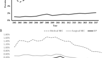 Data for use in this study were supplied by Children’s Hospitals Neonatal Consortium, Inc. (CHNC). Any analysis, interpretation, or conclusion based on these data is solely that of the authors, and CHNC specifically disclaims responsibility for any such analysis, interpretation, or conclusion. We’d like to acknowledge additional members of the CHND Surgical NEC Focus Group, not otherwise listed as a contributing author, who participated in part in this project, including Michael Padula, Allison Rose, Lynn Fuchs, Carla Snider, Kera McNelis, Hala Chaaban, Hannah Hightower, Bonny Jasani and Catherine Hunter. We’d also like to thank the CHNC leadership and executive committee without whom this work would not have been possible: Jeanette Asselin (ex officio), David Durand (ex officio), Francine Dykes (ex officio), Karna Murthy (Chair), Michael Padula, Eugenia Pallotto, Theresa Grover, Beverly Brozanski, and Anthony Piazza, Kristina Reber, Joanne Lagatta, Joan Smith, Lamia Soghier, Billie Short, and Jacquelyn Evans are members of the Children’s Hospitals Neonatal Consortium, Inc. For more information, please contact: support@thechnc.org. Finally, we are indebted to the following institutions that serve infants and their families, and these institutions also have invested in and continue to participate in the Children’s Hospital’s Neonatal Database (CHND). The site sponsors/contributors for the CHND are also included: 1. Children’s Healthcare of Atlanta Egleston, Atlanta, GA (Anthony Piazza). 2. Children’s Healthcare of Atlanta at Scottish Rite, Atlanta, GA (Gregory Sysyn). 3. Dell Children’s Hospital, Austin, TX (Ashley Lucke, Molly Pont). 4. Children’s Hospital of Alabama, Birmingham, AL (Carl Coghill, Allison Black). 5. Children’s Hospital Boston, Boston, MA (Anne Hansen). 6. Levine Children’s Hospital, Charlotte, NC (Eugenia Pallotto). 7. Ann and Robert H. Lurie Children’s Hospital of Chicago, Chicago, IL (Gustave Falciglia). 8. Cincinnati Children’s Hospital, Cincinnati, OH (Beth Haberman). 9. Cleveland Clinic Children’s Hospital, Cleveland, OH (Hany Aly, Tetyana Nesterenko). 10. Nationwide Children’s Hospital, Columbus, OH (Thomas Bartman). 11. Children’s Health Center, Dallas, TX (Lina Chalak, Sushmita Yallapragada). 12. Children’s Hospital Colorado, Denver, CO (Danielle Smith, Stephanie Bourque). 13. Children’s Hospital of Michigan, Detroit, MI (Girija Natarajan). 14. Cook Children’s Health Care System, Fort Worth, TX (Annie Chi). 15. Connecticut Children’s Hospital, Hartford, CT (Annmarie Golioto). 16. Texas Children’s Hospital, Houston, TX (Kristina Reber). 17. Riley Children’s Hospital, Indianapolis, IN (Rebecca Rose). 18. University of Iowa Children’s Hospital, Iowa City, IA (Julie Lindower). 19. Children’s Mercy Hospitals and Clinics, Kansas City, MO (Julie Weiner). 20. Arkansas Children’s Hospital, Little Rock, AR (Laura Carroll). 21. Children’s Hospital Los Angeles, Los Angeles, CA (Rachel Chapman). 22. American Family Children’s Hospital, Madison, WI (Nina Menda). 23. Le Bonheur Children’s Hospital, Memphis, TN (Mark Weems). 24. Children’s Hospital Wisconsin, Milwaukee, WI (Joanne Lagatta). 25. Children’s Hospital of Minnesota, Minneapolis, MN, (Ann Downey). 26. UCSF Benioff Children’s Hospital, Oakland, CA (Priscilla Joe). 27. Oklahoma Children’s Hospital, Oklahoma City, OK (Patricia Williams, Trent Tipple). 28. Omaha Children’s Hospital, Omaha, NE (Nicole Birge). 29. Children’s Hospital of Orange County, Orange, CA (Michel Mikhael). 27. Advent Health for Children, Orlando, FL (Narendra Dereddy, Rajan Wadhawan). 28. Nemours Children’s Hospital, Orlando, FL (Aaron Weiss). 29. The Children’s Hospital of Philadelphia, Philadelphia, PA (Michael Padula). 30. St. Christopher’s Hospital for Children, Philadelphia, PA (Vilmaris Quinones). 31. Phoenix Children’s Hospital, Phoenix, AZ (Pam Griffiths). 32. Children’s Hospital of Pittsburgh of UPMC, Pittsburgh, PA (Toby Yanowitz). 33. Mayo Eugenia Litta Children’s Hospital, Rochester, MN (Ellen Bendel-Stenzel). 34. Primary Children’s Hospital, Salt Lake City, UT (Con Yee Ling). 35. Rady Children’s Hospital, San Diego, CA (Mark Speziale). 36. Seattle Children’s Hospital, Seattle, WA (Elizabeth Jacobson, Robert DiGeronimo). 37. St. Louis Children’s Hospital, St Louis, MO (Beverly Brozanski, Rakesh Rao). 38. All Children’s Hospital, St. Petersburg, FL (Linda Van Marter). 39. Hospital for Sick Children, Toronto, ON (Kyong-Soon Lee). 40. Children’s National Medical Center, Washington, DC (Billie Short). 41. Nemours Children’s Hospital, Wilmington, DE (Kevin Sullivan). 42. Brenner Children’s Hospital, Winston-Salem, NC (Cherrie Welch).