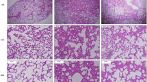 The lung samples were fixed in 4% paraformaldehyde at 4 °C for 48 h, embedded with paraffin wax, and cut into 5 μm-thick sections. The sections were stained with hematoxylin and eosin (Vector Labs, Burlingame, CA, USA) by following a standard protocol. Histopathologic analysis of lung sections was performed as described previously [28]. All the representative images were obtained under ×200 magnification.