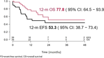 Thirty-one patients experienced the following first events: eight treatment failures, 12 relapses (includes 4 after HSCT), and 11 deaths (five with disease, six in remission). Median follow-up was 112.5 days in the 20 patients without an event, and 137 days in the 27 patients who were alive at last contact (for both, range 19–736 days). Over 75% of patients were followed for at least 82 days. Sites of relapse in the 12 patients who developed disease recurrence post InO were marrow in ten and isolated extramedullary disease in two patients (central nervous system (CNS) and an extracranial mass in one patient, infiltration of ocular muscle, kidney and pancreas in one patient). Overall, 18 (35%) patients were alive in CR and nine (18%) were alive with evidence of disease. Seven patients (14%) died from transplant-related toxicity while 17 (33%) expired from progressive leukemia. The 12-month EFS and OS rates for the entire cohort were 23.4 ± 7.5% and 36.3 ± 9.3% respectively (Fig. 1).