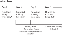 That inflammatory pathways such as interferon-signaling play a key role in the disease progression has recently been shown by genome-wide association studies [11]. Ruxolitinib is an inhibitor of janus-kinases 1 and 2 [12, 13] that play a key role in inflammation. It is approved for the treatment of polycythemia vera and myelofibrosis, and also shows favorable immunosuppressive effects in steroid-refractory graft versus host disease (GvHD) in patients after allogeneic stem cell transplantation [14, 15]. Ruxolitinib has been used in patients with non-severe hyperinflammatory COVID-19 (see La Rosée et al. [16], for example). In keeping, clinical trials have shown that ruxolitinib may be efficacious in COVID-19 [17,18,19]. In a randomized phase III trial, ruxolitinib failed to show an overall survival benefit in patients with COVID-19 (NCT04362137). However, patients in this trial were not severely ill. As the SARS-CoV-2 mediated hyperinflammation is a complication that is associated with excess mortality at a progressed stage of the COVID-19 disease, we reasoned that janus-kinase inhibition using ruxolitinib would be rational in mechanically ventilated patients with COVID-19-associated ARDS.