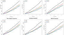 Age at diagnosis was divided into 19 cohorts: (1) 00 years; (2) 01–04 years; (3) 05–09 years; (4) 10–14 years; (5) 15–19 years; (6) 20–24 years; (7) 25–29 years; (8) 30–34 years; (9) 35–39 years; (10) 40–44 years; (11) 45–49 years; (12) 50–54 years; (13) 55–59 years; (14) 60–64 years; (15) 65–69 years; (16) 70–74 years; (17) 75–79 years; (18) 80–84 years; and (19) 85+ years. Year of haematological cancer diagnosis was divided into 8 cohorts: (1) 1975–1979; (2) 1980–1984; (3) 1985–1989; (4) 1990–1994; (5) 1995–1999; (6) 2000–2004; (7) 2005–2009; and (8) 2010–2016. 95% confidence intervals (CIs) of SMRs were obtained using an approximation from a Poisson distribution [20, 22]. The Kaplan-Meier method was used to estimate actuarial probability of death amongst persons with a haematological cancer and competing risk analyses were done to estimate risk of dying from the index cancer, non-index cancer and non-cancer causes.