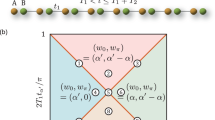 We now apply the Floquet approach to our system of interest. Let us first describe the corresponding Hamiltonian. We consider the systems sketched in Fig. 1, where the hopping amplitudes between the 0th and ±1st lattice sites \(J_{ - 1,0}(t) = J_2 + {\mathrm{\Delta }}J\sin \left( {\omega t + \phi _1} \right),\,J_{0,1}(t) = J_2 + {\mathrm{\Delta }}J\sin \left( {\omega t + \phi _2} \right)\) are time-dependent due to the modulation of the 0th site, which also causes a small time-dependent on-site potential at site 0: V0(t) = −∆V + ∆V cos(ωt). The phase factors are \(\phi _1 = 0,\,\phi _2 = \pi\) for the in-plane modulation and \(\phi _1 = \phi _2 = \pi /2\) for the out-of-plane modulation. Due to specific properties of each experimental realisation, we can set ∆V = 0 for the plasmonic waveguide model (Fig. 1a), while for the dielectric waveguides (Fig. 1b), ∆V ≠ 0 holds (see “Experimental methods” for details).
