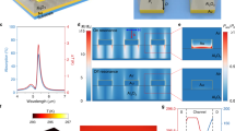 where Δφ is the phase retardation introduced by the QWP (note the fast axis is oriented −45° with respect to the x-axis) and γf and γs are the transmission coefficients of the QWP for the electric field components along the fast and slow axes, respectively. \(\gamma _x^{V/H}\) and \(\gamma _y^{V/H}\) are the transmission coefficients of the polarizing nanograting for the electric field components along the x and y axes, corresponding to the vertical (V) or horizontal (H) nanograting orientation, respectively. We apply equation (1) to calculate the dependence of the CPER on the performance of the QWP and linear polarizer, as shown in Fig. 1c. The results indicate that the maximum CPER occurs at \(\Delta \varphi = \frac{\pi }{2}\) and is ultimately limited by the extinction ratio of the linear polarizer (\({\mathrm{LPER}} = \gamma _i^{V/H}/\gamma _j^{V/H}\) for gratings oriented along the j-axis, i, j = x, y). Therefore, to achieve a high CPER, we need to maximize the LPER and design a perfect QWP with \(\Delta \varphi = \frac{\pi }{2}\).