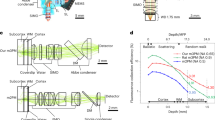 By using different carefully designed MOs to suit different brain regions, the MATRIEX technique essentially offers a high-flexibility ‘three-dimensional multiarea optical interface’ between neural network activity in the animal brain and a two-photon laser scanning system. As shown above, there is 100% compatibility between conventional two-photon microscopy systems and the MATRIEX technique. Therefore, a broad range of other advanced techniques developed for two-photon microscopy are also compatible and may be combined with the MATRIEX technique to further extend the performance and applicability, including, but not limited to, (1) random-access scanning and/or photostimulation methods23,24,25,26; (2) advanced surgical techniques for chronic imaging27; and (3) adaptive optics28 and other point-spread-function shaping techniques29. Overall, we expect that the application of the MATRIEX technique will substantially advance the study of three-dimensional brain-wide neural circuit dynamics with single-cell resolution.