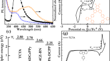 Devices are prepared following the procedure schematized in Fig. S1. Emulsions are obtained by sonication of LC/chromophore mixtures and PVA dissolved in deionized water. The choice of PVA is advantageous for preventing flocculation of the LC droplets through steric stabilization30. The process involves three elementary optically active materials that can be combined in various forms: (i) PVA with blue-emitting 2,2’-([1,1’-biphenyl]-4.4’-diyldi-2,1-ethenediyl)bis-benzenesulfonic acid disodium salt (SB420), (ii) PVA with LC droplets containing green-emitting (3-(2-benzothiazolyl)-7-(diethylamino)-2H-1-benzopyran-2-one) (CM540), and (iii) PVA with LC droplets containing red-emitting 4-(dicyanomethylene)-2-methyl-6-(4-dimethylaminostyryl)-4H-pyran (DCM), with emission peaks at 438, 519, and 590 nm, respectively (Fig. 1a).