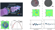 where \({\mathrm{{\Delta}}}k = \frac{{2\pi }}{\lambda }\sin \theta\) is the in-plane wave vector difference between the object and reference beams. If we perform Fourier transformation on the fringe pattern \(\tilde I = \tilde {\cal{F}}\left( {I_{{\mathrm{interference}}}} \right)\), then the first two terms in Eq. (3) produce a peak centred at the origin of reciprocal space, whereas the third and fourth terms correspond to two satellite peaks translated by ±Δk with respect to the origin. These satellite peaks carry information on the wavefront phase, which can be retrieved by maintaining a peak corresponding to \(\sqrt {I_{{\mathrm{obj}}}I_{{\mathrm{ref}}}} e^{i\left[ {\phi _{{\mathrm{metalens}}}\left( {x,\;y} \right) + {\mathrm{{\Delta}}}k \cdot x} \right]}\) in reciprocal space and filtering out all the other peaks. Then, by inverse Fourier transforming this complex amplitude and taking its argument, we can extract the phase distribution by only one-shot measurement (details are shown in Supplementary Information S1). It is worth mentioning that the obtained phase distribution contains two parts: the phase distribution of the metalens and the phase distribution of the measurement system. To eliminate the part contributed by the measurement system, we also measure the phase distribution of the system without a metalens and then perform subtraction. Therefore, the exact phase distribution of metalenses can be obtained without the influences of optical aberration from the measurement system. In contrast to the reference beam coaxial mode, only one photo of the interference pattern is needed in the reference beam off-axis mode, without phase shift processing. Therefore, the reference beam off-axis mode is simple and time-saving. Note that here, the interference is performed in the real-space domain52,53. It can also be applied to the frequency domain to realise white-light interferometry, which has been used to extract the effective refractive index of metamaterials46,47.