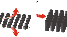 As shown in Fig. 1c, Im(Ez) (transverse dipole mode) corresponds to a sinusoidal wave with neighboring crests and troughs on the left and right surfaces of each pillar, respectively, resulting in upward- and downward-pointing polarizations. These polarizations form a loop and induce, according to Faraday’s law, a magnetization \(\vec M\) with the same amplitude as the applied magnetic field \(\vec H\) but in the opposite direction. Such a magnetization thus cancels out the applied magnetic field \(\vec H + \vec M = 0\). Based on the definition of magnetic flux \(\vec B = \mu _0\left( {\vec H + \vec M} \right)\), we have \(\vec B = 0\). If we treat the metamaterial as a homogeneous bulk medium with an effective permeability μeff, we can express the constitutive relationship as \(\vec B = \mu _{{{{\mathrm{eff}}}}}\vec H\). And, because \(\vec B = 0\) and the fact that the applied magnetic field \(\vec H \,\ne\, 0\), we can conclude that μeff = 0.