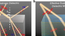 As shown in Fig. 1b, Re(Ez) (monopole mode) corresponds to a sinusoidal wave with troughs in the middle of the pillars, resulting in a polarization \(\vec P\) with the same amplitude as the applied electric field \(\varepsilon _0\vec E\) but in the opposite direction. Such a polarization thus cancels out the applied electric field \(\varepsilon _0\vec E + \vec P = 0\). Based on the definition of electric flux \(\vec D = \varepsilon _0\vec E + \vec P\), we have \(\vec D = 0\). If we treat the metamaterial as a homogeneous bulk medium with an effective permittivity εeff, we can express the constitutive relationship as \(\vec D = \varepsilon _{{{{\mathrm{eff}}}}}\vec E\). And, because \(\vec D = 0\) and the fact that the applied electric field \(\vec E \,\ne\, 0\), we can conclude that εeff = 0.