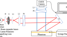 As shown in Fig. 2a, in the tissue phantom, 1% intralipid (Fresenius Kabi, China) mixed with 0.5% agarose (Sigma-Aldrich, USA) gel at a volume ratio of 1:1 was chosen to simulate the turbid tissue because its reduced scattering coefficient was similar to that of in vivo skin45. Capillary glass tube (inner diameter: 0.5 mm, outer diameter: 1.0 mm) was used to simulate the blood vessel embedded in the turbid tissue. The capillary glass tube was insert diagonally into a culture dish (diameter: 32.1 mm, height: 10 mm). Blood was taken from the caudal venous plexus of mice and mixed with heparin sodium (Sinopharm Chemical Reagent, China) to prevent clotting. After drawing mice blood, a micro syringe was clamped on the micro syringe pump, and its needle tip was inserted into the capillary glass tube. Then, the blood was pumped into the capillary with certain velocities.