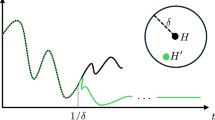 where \({{{\mathrm{Tr}}}}_{{{\mathcal{B}}}}\) takes the trace over the bath, \(\dim \left( {{{{\mathscr{H}}}}_{\delta E_{{{{\mathrm{ME}}}}}}} \right)\) denotes the dimension of the Hilbert subspace \({{{\mathscr{H}}}}_{\delta E_{{{{\mathrm{ME}}}}}}\) spanned by the eigenstates whose energy belongs to the energy window \([E_\alpha - \delta E_{{{{\mathrm{ME}}}}},E_\alpha + \delta E_{{{{\mathrm{ME}}}}}]\), and \({{{\mathrm{I}}}}_{{{{\mathscr{H}}}}_{\delta E_{{{{\mathrm{ME}}}}}}}\) is the identity matrix defined on this subspace. Additionally, the energy window whose size is determined by \(\delta E_{{{{\mathrm{ME}}}}}\) should be macroscopically small to make energy fluctuation small but microscopically large to cover enough energy levels. The ETH guarantees that any superposition state of the energy eigenstates with similar energy can give the same local reduced density matrix, recovering the “universality” of the thermalization. While the ETH is sufficient for understanding the thermalization in non-integrable quantum systems, the existence of the non-trivial conserved quantities and energy degeneracy breaks the validity of this hypothesis down in integrable systems14. For the case of the QW model, since the energy eigenstates with opposite momentum ±k have the same energy, without loss of generality, the system’s eigenstate in the degenerate subspace with energy E0 can be represented as \(\left| {E_0} \right\rangle = a_ + \left| {{{{\mathbf{n}}}}_{{{\mathcal{H}}}}(k_0)} \right\rangle \otimes \left| {k_0} \right\rangle + a_ - \left| {{{{\mathbf{n}}}}_{{{\mathcal{H}}}}( - k_0)} \right\rangle \otimes \left| { - k_0} \right\rangle\), where a± are the normalized complex amplitudes. However, as shown in Supplementary Section C, the reduced density matrix of this eigenstate explicitly depends on the details of the amplitudes a±, indicating a failure of the ETH.