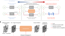On the other hand, “external generalization” to new objects from entirely new types of samples, never seen by the network before, remains a major challenge for deep neural networks, which might lead to image reconstruction degradation or hallucinations. Some studies have explored using transfer learning to address this challenge, which requires fine-tuning the network using a subset of the new types of samples48,49,50. In addition to this external generalization issue, it is, in general, difficult for CNN-based image reconstruction networks to accurately reconstruct raw holograms of samples due to the limited receptive field of convolutional layers, which casts another challenge considering the relatively large scale of holographic diffraction patterns of samples. As a result, existing end-to-end hologram reconstruction deep neural networks24,26,33,35,42 could only achieve decent reconstruction performance on relatively sparse samples. Alternatively, a pre-processing step, such as zero phase-padded free space propagation (FSP), has also been utilized to better deal with this issue23,25,26,40,42, which requires a precise physical forward model with the correct estimate of the axial propagation distance.