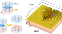 where \({\it{\epsilon }}_m( {{{\boldsymbol{k}}}} ) = {\it{\epsilon }}_c\omega _q^2/[ {\omega ^2 - \omega _0^2 + \alpha ( {k_x^2 + k_y^2} )} ]\) takes into account the nonlocal optical response of metallic structure45,46,47 (∈c is the effective relative permittivity, α is a constant for scaling the nonlocal effect, ω0 and ωq are the effective resonance angular frequency); \({\it{\epsilon }}_s = \omega _p^2/\left( {\omega ^2 - \omega _1^2} \right)\) and \({\it{\epsilon }}_d = \omega _1\omega _p^2/\left[ {\omega \left( {\omega ^2 - \omega _1^2} \right)} \right]\) arise from the gyro-electric response of magnetized plasma (ωp and ω1 are the effective plasma and cyclotron frequencies respectively). We highlight the k-dependence of the parameters in this model because the nonlocal effect plays an important role to form the type-I ideal WP in our system, see SI, Fig. S5 for details of this analysis. A good agreement between the effective medium model and the practical construction is achieved around the Weyl frequency, as shown in detail in the SI (Sec. II and Fig. S6). In the following simulations, the realistic parameters are chosen: \({\it{\epsilon }}_c = 0.83\), \(\alpha = 6.8 \times 2\pi \times 10^{15}\,{\mathrm{rad}}^2/s^2\), \(\omega _q = 1.8 \times 2\pi \times 10^{10}\,{\mathrm{rad}}/s\), \(\omega _0 = 2.22 \times 2\pi \times 10^{10}\,{\mathrm{rad}}/s\), \(\omega _p = 5 \times 10^{10}\,{\mathrm{rad}}/s\), and \(\omega _1 = 1.22 \times 10^{10}\,{\mathrm{rad}}/s\).