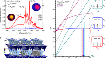 where \(E_{{{{\mathrm{a}}}},2}\) is the activation barrier for crossover from 5D1 to the CTS and \(k_{{{{\mathrm{CT}}}}}\) is the rate constant21,22. We again acquire the luminescence at 7 K and find an intrinsic nonradiative rate \(k_{{{{\mathrm{nr}}}}}(0)\) of 5.6 ms−1 that is similar to Y2O3 as expected from the comparable vibrational energies7. In contrast, the obtained radiative rates \(k_{{{{\mathrm{r}}}},1}\) of 2.3 ms−1 and \(k_{{{{\mathrm{r}}}},2}\) of 1.0 ms−1 are relatively high, which is explained by mixing of the CTS into the 5DJ states. Admixture of opposite-parity states into 4fn states induces forced electric-dipole transitions and is strongly enhanced if the energy difference is reduced, resulting in large Judd-Ofelt parameters Ω2, Ω4 and Ω623. This can explain the high radiative decay rates. Note that a low-energy opposite-parity state can also enhance the nonradiative coupling rates if the transition has electric-dipole character. However, no enhancement is expected for the 5D1–5D0 transitions due to the magnetic-dipole nature of this transition. Using \(k_{{{{\mathrm{nr}}}}}(0)\) and \(k_{{{{\mathrm{r}}}},2}\) as input, we fit the experimental decay rates up to 423 K to Eq. 1 and obtain a \(\hbar \omega\) value of 498 cm−1 (black dashed line). Then, we fit the full range of decay rates to Eq. 7 with the obtained value for \(\hbar \omega\) and the reported value for \(E_{{{{\mathrm{a}}}},2}\) (6100 cm−1) as additional input to find \(k_{{{{\mathrm{CT}}}}}\) (1.6 × 108 ms−1)19. The excellent agreement between the data and the model (solid blue line) indicates that thermally activated crossover to the CTS is an additional nonradiative path from 5D1 for Eu3+ in Y2O2S.