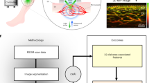 It has been demonstrated that OCT angiography (OCTA) and ultra-wideband raster scan optoacoustic mesoscopy (UWB-RSOM) both have the potential to indirectly detect vasculature by capturing small signal variations resulting from micro-flows, thereby presenting non-invasive approaches for evaluating cutaneous changes in human skin microvasculature23,27,28,29,30,31,32,33. In this work, we have chosen to focus on UWB-RSOM due to certain key features. UWB-RSOM is a notably robust method for visualizing deep dermal microvasculature features (up to 1.5 mm deep) and this ability will enable our search to identify novel biomarkers of skin microangiopathy in diabetes. Furthermore, RSOM offers detection with an enhanced signal-to-noise ratio due to the generation of optoacoustic signals within blood vessels primarily. This phenomenon allows for optimal microvascular imaging of the skin, while retaining high contrast due to the relatively high absorption of hemoglobin at the wavelength of 532 nm28,34,35,36,37,38,39. Furthermore, it was important to obtain highly detailed cross-sectional images of human skin at high penetration depth because these images would offer valuable information for diagnosis, treatment monitoring, and translational research from understanding skin physiology and pathology and indeed UWB-RSOM can provide such images to a depth of ~1.5 mm.