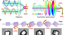 Finally, we treat the \(x\)-polarised \(l=1\) vortex beam [Fig. 2c], whose OAM leads to the most surprising spin decomposition features of the three. Numerically simulating such a non-paraxial, focussed beam is a challenging task because there is no unanimous 3D definition of a vector vortex beam (only scalar and paraxial beams are well-defined). The beams treated in this section are all electric linearly polarised and generated numerically using an angular spectrum integration technique46 which, by convention, forces the electric field to exactly match the paraxial description of the beam in the focal plane. All unenforced field components (i.e., all magnetic field components and the longitudinal electric component throughout space, and the transverse electric components outside of the focal plane) are subsequently calculated via Maxwell’s equations. While the beams are, therefore, physically valid, some magnetic-biased polarisation features develop in the \(x\)-polarised vortex beam considered here. In particular, although the electric field remains perfectly linear, the magnetic field alone gains a slight ellipticity in the transverse plane, contributing to a small longitudinal total spin outside of the beam centre as has been shown to exist in focussed linearly polarised beams16. Longitudinal spin remains zero in the singularity, however. Breaking continuous rotational symmetry via \(x\) polarisation, both the vortex beam’s electric and magnetic fields possess a \(z\) component from focussing, in contrast to the azimuthal beam for which the electric field is perfectly linearly polarised in 3D. The beam has helical wavefronts so that the average phase gradient (local wavevector) has an azimuthal component, also inherited by the Poynting vector (shown in the second row of Fig. 2c; there is a small transverse component circulating in the \({xy}\) plane). The Poynting spin \({{\bf{s}}}_{{\rm{p}}}\propto \nabla \times {\bf{P}}\), therefore, acquires a longitudinal component (even at the centre of the beam), in outright defiance of the fact that both transverse electric and magnetic fields are nearly linearly polarised, and zero in the centre, as is visible in the lowest plot of Fig. 2c. To neutralise the longitudinal Poynting spin and suppress the total longitudinal spin, the \(z\) component of canonical spin \({{\bf{s}}}_{{\rm{c}}}\) must be non-zero too, satisfying \({s}_{{\rm{c}}z}=-{s}_{{\rm{p}}z}\) for \({S}_{z}={s}_{{\rm{c}}z}+{s}_{{\rm{p}}z}=0\) in the centre of the beam, and \({S}_{z}={s}_{{\rm{c}}z}+{s}_{{\rm{p}}z}\approx 0\) elsewhere (see the plot second from bottom). In the middle of the beam, this counteracting canonical spin points in the negative \(z\) direction as a consequence of the beam’s vortex right-handedness, and would switch sign in a left-handed vortex. Returning now to the chiral force equation Eq. (5), we can infer that the beam’s non-zero canonical spin, proportional to chiral momentum, produces a longitudinal chiral force, even though near to the vortex centre the \({\bf{E}}\) and \({\bf{H}}\) fields have negligible ellipticity in the transverse plane. Perhaps counter-intuitively, the longitudinal chiral force is strongest in the centre of the beam where the electromagnetic field is virtually zero. Its vortex structure causes the curl of the Poynting vector to be maximal in the central singularity and hence canonical spin, which is equal and opposite along \(\hat{{\bf{z}}}\) (ensuring that \(({{\bf{s}}}_{{\rm{c}}}+{{\bf{s}}}_{{\rm{p}}})\cdot \hat{{\bf{z}}}={\bf{S}}\cdot \hat{{\bf{z}}}=0\)), must also be at its maximum. This is another example of spatially chiral light coupling to chiral matter which, even under the dipole approximation and in a linearly polarised field, can feel a discriminatory force by absorbing or scattering photons carrying OAM of a certain handedness. Only recently has OAM-dependent chirality, able to couple even to chiral dipoles, been demonstrated in focussed beams, resulting from strong longitudinal field components17,47. We point out, however, that the chiral pressure force which we theorise at the centre of a linearly polarised vortex appears only to require that the Poynting vector has an azimuthal component (i.e., no requirement for longitudinal field components), and should still be present in a paraxial beam.