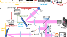 Other volume optical components refer to the ordinary single-mode fibers, dispersion fibers, modulators, attenuators, filters, Fabry-Perot laser with saturable absorber, polarizing beam splitter, wavelength-division multiplexing (WDM) system, etc., which can flexibly construct ONNs in different combinations62,63,64,65,66,67,68,69,70,71,72,73,74,75,76. In 2012, Duport et al.62 achieved the experimental demonstration of all-optical reservoir calculation for the first time based on single-mode fibers, semiconductor optical amplifiers (SOA), tunable optical attenuators, delay loops, bandpass filters, etc. (Fig. 9a). Meanwhile, the nonlinearity is provided by the saturation of the optical gain in the SOA. In 2021, Stelzer et al.71 constructed the computational function of a single neuron using a nonlinear device and multiple time-delay feedback loops and implemented a deep neural network of any size by continuously iteratively reconstructing the parameters of the single neuron. The network’s connection weights were implemented by adjusting the feedback modulation signal and delay within the loop, as shown in Fig. 9b.