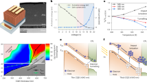 We further studied the vertical charge transport path at the PbS QDs/IGZO interface by measuring the photoluminescence (PL) of PbS QDs films on IGZO substrates (Fig. 2h). The PL intensity of PbS QDs/IGZO film decreases when the ligand chain is longer. As a reference, the PL intensity of PbS films shows an opposite trend33. This result infers that more excitons are quenched at the interface of IGZO from PbS QDs films passivated by DDT, indicating a better charge transport at the DDT-PbS QDs/IGZO interface. Better vertical transport is further supported by measuring the space charge limited current (SCLC) based on the device structure ITO/IGZO/PbS QDs/ZnO/Al (Fig. S8). The fitted effective mobility doesn’t show a simple trend according to chain length but shows efficient vertical electron transport for not only very short ligands such as EDT but also for long ligands such as DDT. It can be inferred that ligand orientation at the interface of PbS QDs/IGZO is potentially laid horizontally instead of standing vertically, inducing a more efficient electron transport in the vertical path than the horizontal one. Considering the horizontal transport, tail states trapping and vertical transport, maximum electron injection between PbS QDs and IGZO channel could be achieved by DDT exchange because of the highly suppressed horizontal inter-dot transport, limited tail states, and efficient vertical transport to IGZO channels.