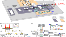 To verify the viability of the SCE, we use fiber-optic components and an implementation based on a 90∘ optical hybrid, according to Fig. 2b. We record an exemplary error signal \(U_{\rm{err}}(t)\) in the open-loop as well as in the closed-loop configuration, see Fig. 3a and c, respectively. As expected, using fiber optic components leads to a significant drift of the optical phase within 10 s if the active phase stabilization is turned off. As a result, we observe randomly occurring destructive or constructive interference within the three overlap regions of the overall output signal, leading to a random variation of the BPD’s output voltage between approximately −1 V and +1 V, Fig. 3a. The randomly occurring destructive or constructive interference is visualized in Fig. 3b, where 50 superimposed optical spectra of the overall output waveform \({\underline{a}}_{{\rm{out}}}(t)\) are shown and where strong random dips are observed in the three overlap regions. By closing the control loop, the error signal \(U_{\rm{err}}(t)\), Fig. 3c, and consequently the phase error \(\Delta\varphi(t)\) are minimized. As a result, all superimposed tributaries interfere constructively, and the spectral dips disappear as can be seen from the 50 superimposed spectra shown in Fig. 3d. Note that our current experiments rely on a piezo-based fiber stretcher (FPS-003, General Photonics, now part of Luna Innovations) with a tuning range of 55π. When used with extended fiber-based setups, the fiber-stretcher typically reaches its limit within a few tens to a few 100s of seconds, which triggers an automatic reset of the underlying digital proportional-integral (PI) controller. This undesirable reset can be avoided in future implementations by using an endless phase shifter instead of the fiber-stretcher29 or by integrating the system, such that a simple phase shifter with finite tuning range is sufficient30,31,32.