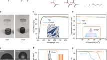 Ionic liquids, recognized for their environmental compatibility and versatile functionality, have been recently employed to modify interfaces and passivate NCs/QDs effectively11,12,13. Aided by the self-solvent property and cationic components, they could combine with metal ions thus forming (semi-)transparent glasses with zero-dimensional structures at mild heating temperatures. For example, in 2002, Mitzi et al. originally reported on a perovskite film (2-FPEA)2SnI4 (2-FPEA = C6H4FC2H4NH3), which possessed a relatively low melting temperature of ~200 °C, enabling its conversion into transparent thin film14. However, the immediate crystallization would occur once cooling to room temperature, hindering the investigation for amorphous state. Then, exploring the melting and quenching conditions for preparing stable hybrid glass became a popular research focus, of which the trend continued until that the S(1-1)NPB (S-(1-1)napthylethylammonium lead bromide) was demonstrated to readily enable access to a glass state through quenching from the melt in 2020 (ref. 15,16). Recently, with the develop of lead-free perovskites, ns2 and RE-based (RE = rare earth) hybrid luminescent glasses with shape-on-demand characteristics were gradually explored, such as (Bmmim)2SbCl5 (Bmmim = C4H6N2C4H9, ref. 17), (HTP/ETP)2MnBr4 (HTP = (C6H5)3PC7H15, ETP = (C6H5)3PC2H5, ref. 18,19), ETP2SbCl5 (ref. 20,21), and RE(NO3)3(C5H2N4)2 (ref. 22), etc. Although the microscopic mechanisms of the powder-glass transition and specific structural distortion are still unclear, the hybrid glasses have indeed exhibited exceptional performance in various applications including memory and computing23,24, energy storage25,26, thermoelectric27, photovoltaic28 and X-ray detection29,30, etc.