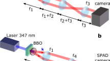 The ROI of the EMCCD is set to 165 × 165 pixels in the phase measurement experiment and 105 × 71 (binned) in the imaging one. The EM gain (set to 0 when taking the direct image in Fig. 1a), horizontal pixel readout rate, vertical pixel shift speed, and vertical clock voltage amplitude are set to 1000, 10 MHz, 0.6 μs and +2 V, respectively. The exposure times are different in each measurement, determined by the beam intensity, so that roughly \(1/5\) of the pixels in the ROI have photons in each frame34 (see Supplementary Information 2 for the values in the phase measurement experiment. In the imaging experiment, the exposure times are 1.4 ms, 1.8 ms, and 2.4 ms for the no-film, film, and film with correction case, respectively. The EMCCD sensor is cooled to −53 °C and −38 °C in the phase measurement and imaging (a higher frame rate produces more heat) experiment, respectively. When taking the three direct images, the exposure time is 0.1 s, and 1000 frames are directly summed for each case.