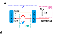 We take \(4.41\times {10}^{6}\) frames in each of the three cases: no film, film, and film with correction, as well as direct images without pixel binning. The direct images, conditional probability distributions (CPDs) of one photon with the other photon postselected to a certain pixel, centroid distributions, and JPDs of anti-correlated pixel pairs are shown in Fig. 4. The anti-correlated pair distributions have central symmetry, so the object patterns exist on the other halves of the images. When the film is present, the object cannot be identified in the direct image or the anti-correlated pair distribution. After correction, they are visible again, but a bit blurry because the slightly curved film about 2 mm away from the SLM liquid crystal plate cannot be regarded as a pure phase object at exactly the SLM plane. A part of the photons are reflected or scattered after passing through the film twice, equivalent to a lower quantum efficiency of the sensor, so the signal-to-noise ratios (SNRs) of the conditional distribution and the anti-correlated pair distribution in the film with correction case are much lower than the no-film case. The centroid distribution, which is the metric of the sensorless adaptive imaging method11, is peaked at the center point in the no-film or film with correction case, while scattered in the film case.