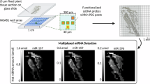The well size and post size can be adapted for a particular application using this nanoliter well array approach. There is a balance between the spatial resolution and how much miRNA is present within the tissue. If we decrease the well size, there will be less miRNA present per well. Even if the concentration of miRNA in a tissue is approximately the same for different well sizes, because the off rate of the miRNA–probe interaction is much slower than the timescale of the assay40 and our hybridization step is much longer than the timescale for miRNA diffusion and reaction to a post24, the total amount of miRNA per well is relevant to the signal following the assay, not the concentration. Based on our previous experience with similar tissue sections, we expected ~5 attomole miR-21/mm2 tissue25. We chose 300 µm wells because we expected to be able to measure multiple miRNAs at this length scale and still be able to make multiple measurements of each tumor to assess heterogeneities within tumors (see Supplementary Note 2 for a calculation and comparison to previous work). The well shape and post shape can also be fine-tuned depending on the application. Previous work measuring miRNAs from cells used circle posts and wells24, whereas here, we used square posts and wells for better packing and easier registry across a tissue section. We can also reduce the well and post size to improve spatial resolution. Previous work has demonstrated photolithography of hydrogel features of 1.25 µm in size41 and fabrication of wells in arrays as small as 15 µm in diameter42. By implementing amplification schemes as described above, reducing well size, and reducing post size, we could work towards single cell resolution in future work.
