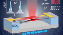 where \({T}_{{{\rm {ac}}}}\) is the temperature fluctuation, \({v}_{{{\rm {ac}}}}\) the input voltage, \({X}_{{{\rm {th}}}}\) the displacement fluctuation and \({i}_{{\rm {m}}}\) the output current. \({R}_{{{\rm {th}}}}\), \({C}_{{{\rm {th}}}}\) and \(\alpha\) represent thermal resistance, thermal capacitance and thermal expansion coefficient of the actuating nanobeam. \(E\) is the Young’s modulus, \({\omega }_{0}\) the natural frequency of the resonator and \({\pi }_{{\rm {l}}}\) the piezoresistive coefficient. Through the transfer functions of Joule heating and thermal expansion effects, the thermal expansion force can be written as