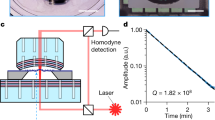 A 10 µm-thickness silicon-on-insulator (SOI) wafer was used to fabricate the device based on a dicing-free fabrication process30. The nanobeam is designed with a width of 1 µm. Due to over-etching, the fabricated width of the nanobeam is measured ~760 nm. An optical image of the resonator is shown in Fig. 2a. The device layer is n-doped with a dopant concentration of 5 × 1018 cm–3, resulting in a negative piezoresistive coefficient. The nanobeam acts simultaneously as an actuator and a displacement sensor.