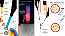 where the pressure difference (∆P) is derived from the centrifugal force \({F}_{c}\), which drives the liquid flow through the nozzle generating droplets, and the flow rate \(Q\) divided by the droplet volume \(V\) gives the number of particles generated, \({d}_{{nozzle}}\) is the nozzle diameter, \(\eta\) is the viscosity, and \({L}_{{nozzle}}\) is the nozzle length. Using this flow rate and the droplet volume, the number of droplets per second can be calculated for different rotational velocities. For example, the experimental data showed 34 droplets at 900 rpm and 55 droplets at 1100 rpm, which are close to the calculated values of 45 and 100 droplets, respectively. The minor discrepancies are likely due to variations in viscosity, nozzle imperfections, or droplet coalescence. The effects of rotational speed and nozzle diameter on core size and shell thickness are illustrated in the 3D plots presented in Fig. 3a, b, respectively. This demonstrates that reducing the nozzle size and increasing the rotational speed led to a decrease in core size. The smallest microspheres, while still having an AR near 1, were obtained with a nozzle diameter of 340 µm and 2000 rpm. In contrast, the shell thickness exhibited minor dependence on rotational velocity and was primarily governed by the incubation duration in the sodium alginate solution. The histograms in Fig. 3c show the distribution of core diameter and shell thickness produced with different nozzle diameters at different rpm values, showing a clear trend of the negative correlation between core diameter and rpm, reinforcing the broad distribution in shell thickness. Each group’s average and standard deviation (S.D.) are displayed in the respective distributions. A Gaussian fit was applied to visualize the distribution of data.