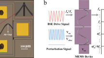 With the resonator hermetically sealed in a metal package with a pressure of less than 0.1 Pa, we characterized the dynamic responses of the resonator. The vibrational motion was actuated and detected using the electrostatic transduction method. A Zurich Instrument lock-in amplifier (HF2LI) was utilized to generate the desired alternating current (AC) driving voltage Vac, and a low noise power supply was utilized to generate the desired DC driving/detection voltages (Vd and −Vd) on the electrodes and DC voltage (V0) on the resonator body. \({V}_{d}\) and \({V}_{0}\) were maintained at 30 V and -30 V respectively, unless otherwise specified. It is worth noting that the voltage difference between electrode 4 and the resonator body was set to zero to permit the detection of only the feedthrough signal \({i}_{m}^{{\prime} }\). When the feedthrough signal \({i}_{m}^{{\prime} }\) is subtracted from the current signal \({i}_{m}\) comprising both the response signal and the feedthrough signal, a clean motion signal without feedthrough can be obtained.