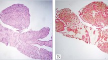 On microscopical examination, all the tumors showed a well-delimited lesion. A solid papillary architecture (7/9) and a cystic architecture (2/9) were observed (Fig. 1a, b). The solid papillary architecture consisted in nests closely packed or separated by a dense fibrous stroma (Fig. 2). Papillae were always observed, lined by neoplastic cells and centered by fibrovascular cores, sometimes containing foamy macrophages (3/9). In some areas of the tumor, a gyrate architecture was identified with concentric arrangement of the rows of epithelial cells.