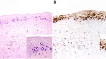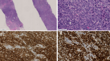 The lymphoma cells of breast implant ALCL resemble systemic ALCL at nodal or extranodal sites [2, 27, 28, 31, 48, 54,55,56,57,58,59,60,61,62,63,64,65]. The lymphoma cells are large, non-cohesive with pleomorphic and anaplastic morphology, and abundant eosinophilic cytoplasm. The cell nuclei are large, oval or multilobated, with vesicular or dense chromatin, and usually have prominent nucleoli and frequent mitoses (Fig. 5a inset). The so-called hallmark cells with a horseshoe-, kidney-, or wreath-shaped nucleus are found in approximately 70% of cases, but their frequency among neoplastic cells is variable, and more common is that they are rather few. (unpublished data) The lymphoma cells appear as small clusters within the effusion or floating clots as the inner lining of the fibrous capsule. Abundant necrotic “ghost” cells rather than fibrin are noted on close inspection in most cases. Immunohistochemistry using CD30 highlights almost all the identified lymphoma cells on hematoxylin and eosin, as well as the outlines of ghost cells or the necrotic debris that is distinctly granular with anti-CD30 (Fig. 5b).