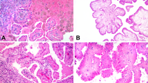 Targeted NGS also revealed mutations in TP53, BRCA2, and BRAF in tumors no. 3, 8, and 9, respectively, and duplication in BRCA2 in tumor no. 1 (Fig. 2). BRCA2 is a tumor suppressor gene and is known to predispose patients to breast and ovarian carcinoma [14, 15]. A frameshift duplication c.5073dup (p.Trp1692Metfs*3) and missense mutations c.4258 G > T (p.Asp1420Tyr) were identified in the BRCA2 gene (NM_000059.3) in two tumors (no. 1 and 8, respectively). Both have been reported as pathogenic somatic mutations in cancer (COSMIC v89) [16, 17]. Tumor no. 3 harbored missense mutation in the TP53 (NM_000546.5) tumor suppressor gene c.638 G > A (p.Arg213Gln). This mutation is recurrent in many sporadic and familial tumors [18]. Lastly, one tumor (no. 9) carried BRAF (NM_004333) c.1798_1799delGTinsAG (p.Val600Arg) mutation, which is reported in melanoma, colorectal, and pancreatic carcinoma (COSM474) [16, 17]. This tumor lacked KRAS mutation. BRAF protein is a downstream effector in the KRAS pathway and the mutual exclusivity of these two mutations has been suggested by some researchers [19, 20]. Representative histologic images of the analyzed tumors are shown in Fig. 3.