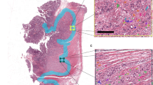 The presence of tumor cell nests was evaluated on H&E stained whole slide sections as described previously [9, 10]. Accordingly, tumor nest size was classified as single cell invasion, small tumor nests (2–4 cells), intermediate tumor nests (5–15 cells), and large tumor nests (≥15 cells). Tumor nest size was evaluated at the tumor invasive front and tumor center separately, and the smallest nest size was recorded. Single cell invasion and small tumor nests correspond to tumor buds. Intermediate and large tumor nests are shown in Fig. 1g, h.