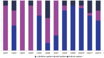 Morphologic and immunohistochemical characteristics are illustrated in Fig. 1 and Table 2. By definition, all conventional-type ACCs displayed a dual epithelial/myoepithelial cell population. These tumors were grade 1 or 2 according to the E&E and Ro grading systems, whereas solid-type ACCs were E&E grade 2 or 3 and Ro grade III, except for one tumor (case 27) which was Ro grade I, displaying a cribriform pattern but without a dual population (Supplementary Fig. 1). Tumor cell necrosis was present in two conventional-type ACCs and six solid-type ACCs (Supplementary Fig. 1). Only one tumor (case 30, in the solid-type ACC group) had perineural invasion (Supplementary Fig. 1).